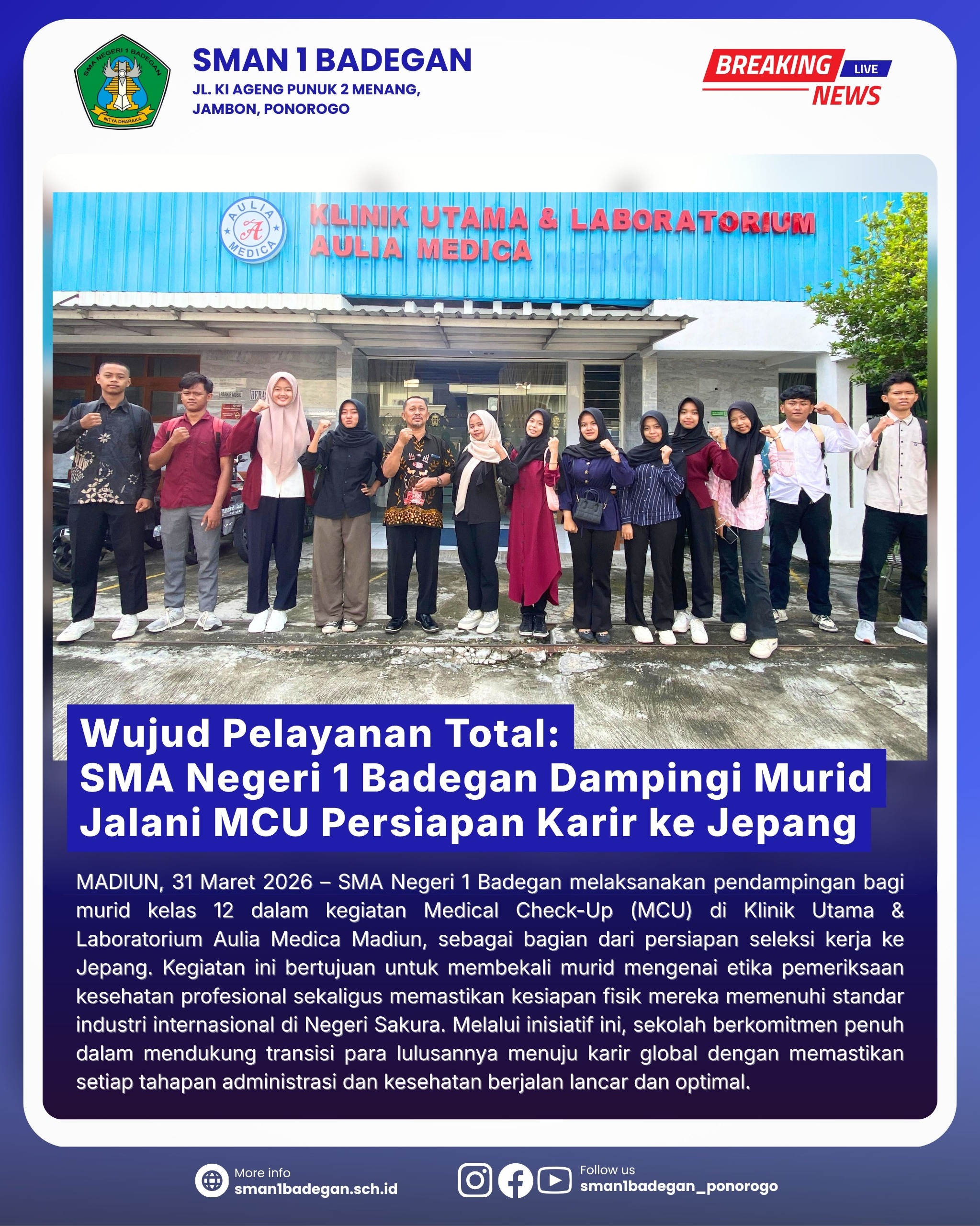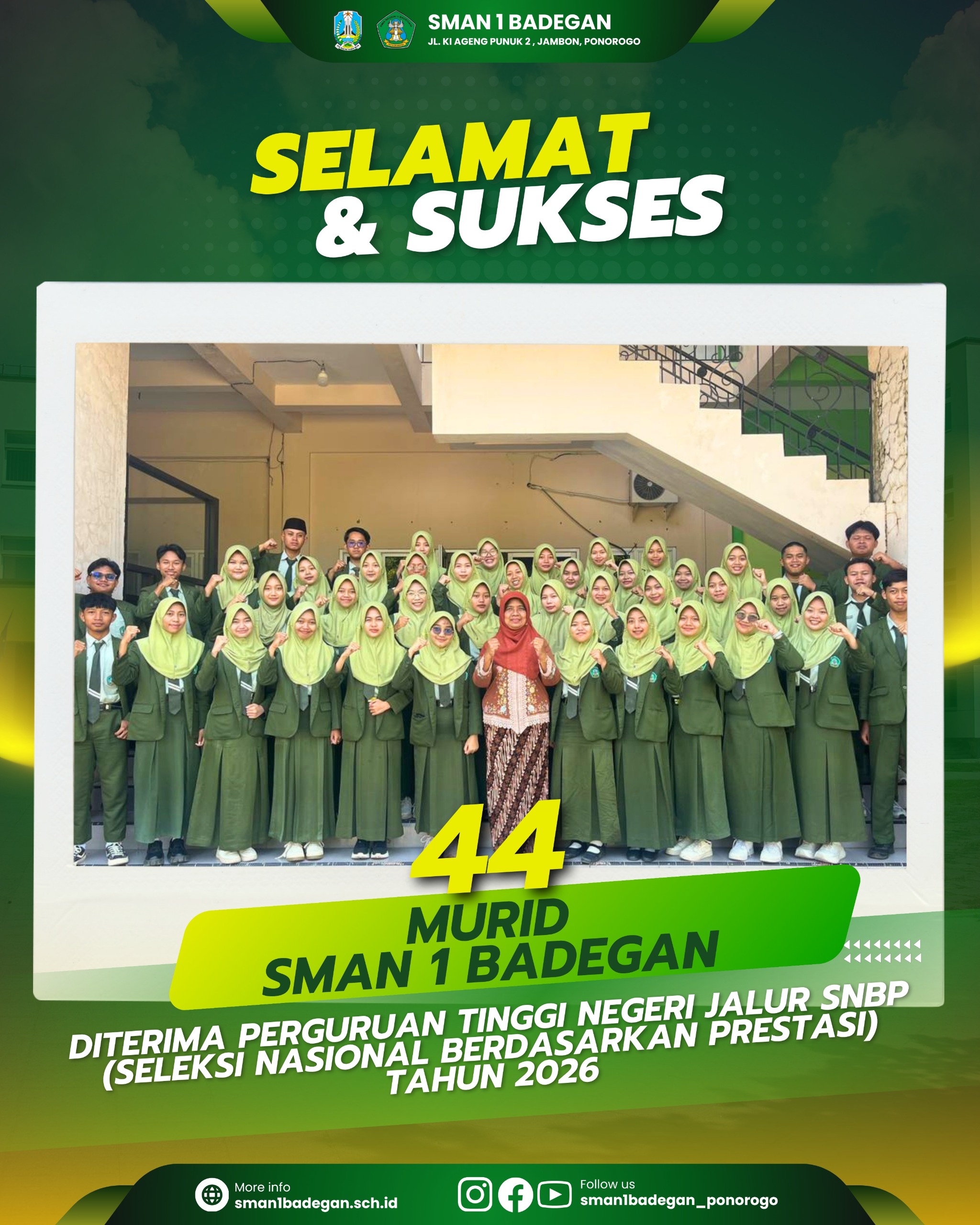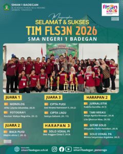 Alhamdulillahi robbil alamin, ashalatu wassalamu ’ala Muhammadin waalihi washahbihi ajmain. Puji syukur kehadhirat Allah SWT, dengan rahmat dan karunia-Nya lah akhirnya Website sekolah dengan alamat www.sman1badegan.sch.id dapat diperbaharui. Kami ucapkan selamat datang di Website kami SMA Negeri 1 Badegan. Saya harapkan seluruh unsur komite, guru, karyawan dan siswa serta khalayak umum guna dapat mengakses seluruh informasi tentang segala profil, aktifitas/kegiatan serta fasilitas sekolah kami.