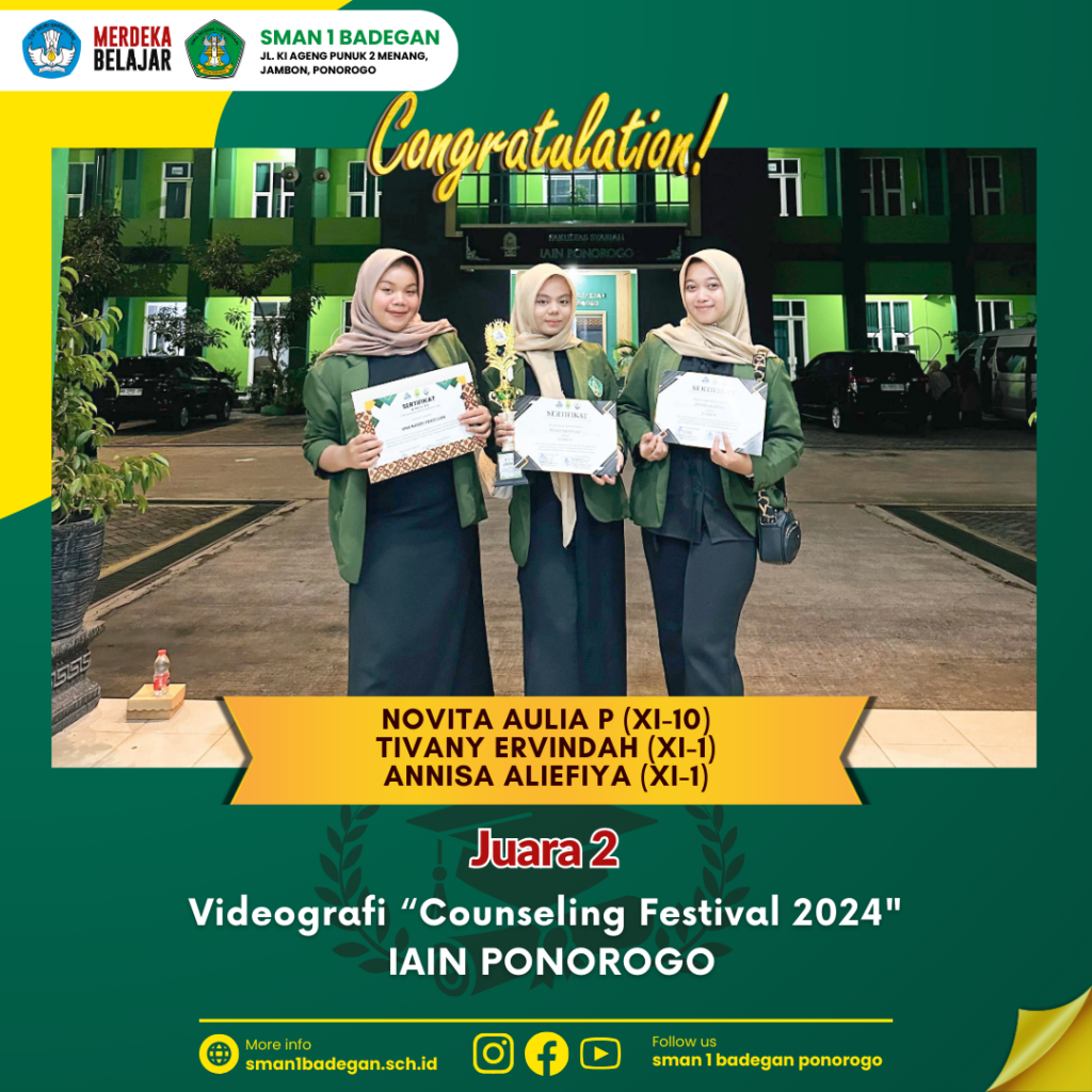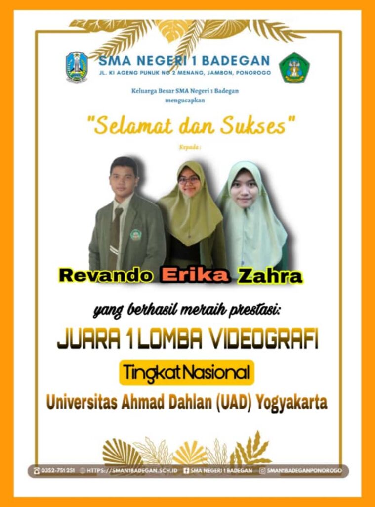 Bahagia itu sederhana, bersyukur atas nikmat prestasi yang lahir dari siswa/i yang berkarya tanpa henti. Puji syukur Alhamdulillah, Kali ini prestasi membanggakan berhasil diraih oleh ELHAM CAHYA RAHMADANI (XII MIPA 4/ALUMNI SMPN 1 KAUMAN), FITRIA AMALIA (XI IPS 4/ ALUMNI SMPN 6 PONOROGO), DAN KRISTINA YULIA WARDANI (XII MIPA 3/ ALUMNI SMPN 2 PONOROGO) yaitu: […]